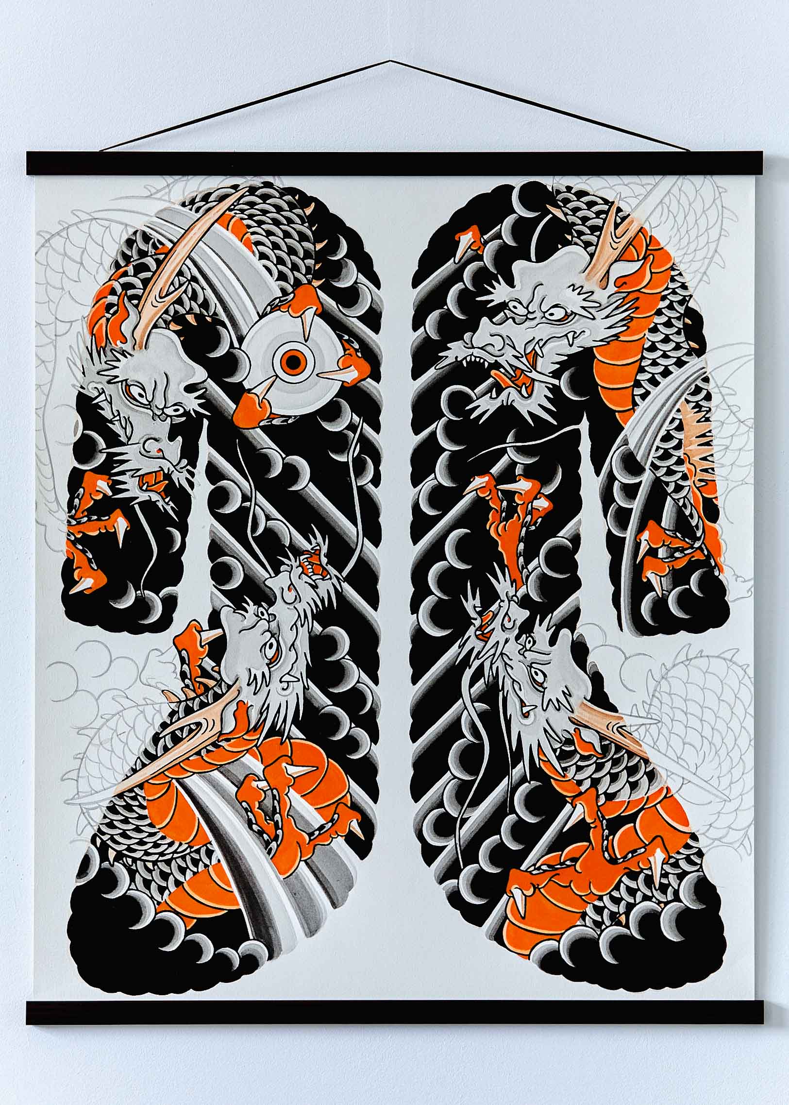 Indulge in the timeless allure of Japanese tattoo art with our exquisite Japanese dragon munewari Print, meticulously crafted to capture the essence of tradition and mastery. Each print is a masterpiece, meticulously designed to adorn your walls with the rich tapestry of Japanese culture and symbolism. Immerse yourself in a realm of mythical creatures. Delicate cherry blossoms and swirling waves await, as our prints whisk you away to the essence of ancient Japan. Elevate your space with the unmatched beauty and grace of Japanese tattoo artistry. Allow your walls to narrate a tale of passion, strength and profound elegance with our Japanese dragon munewari Print. For deeper insights, explore our dragon blog post and find your next tattoo inspiration!